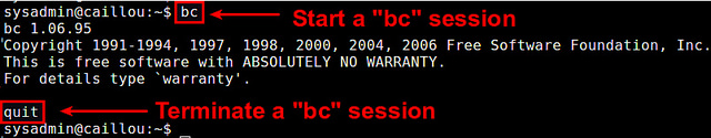 如果你没有一个预先写好的bc脚本,那么你可以在交互模式下运行bc。在这种模式下,你输入的以回车结束的任何声明或者表达式会被立刻计算出结果。你需要输入以下命令来进入bc的交互界面。如果想退出bc,你可以输入’quit’并且按回车。