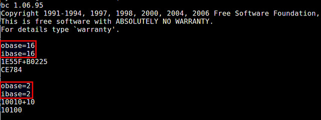 经常会发生的是,你输入一个表达式并且想使用二进制或者十六进制来显示结果。bc允许你在输入输出数字的进制间转换。输入和输出的数系基分别存储在ibase和obase变量中,默认值为10,有效的数值是2到16(或者环境变量BCBASEMAX的值)。你只需要更改ibase和obase的值就可以在不同进制之间转换了。下面是一个求两个十六进制/二进制数和的例子: