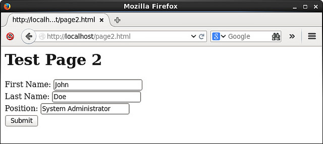 对于这个方案,我们将通过创建一个含有三个输入域和一个提交按钮的网页/var/www/html/page2.html开始。