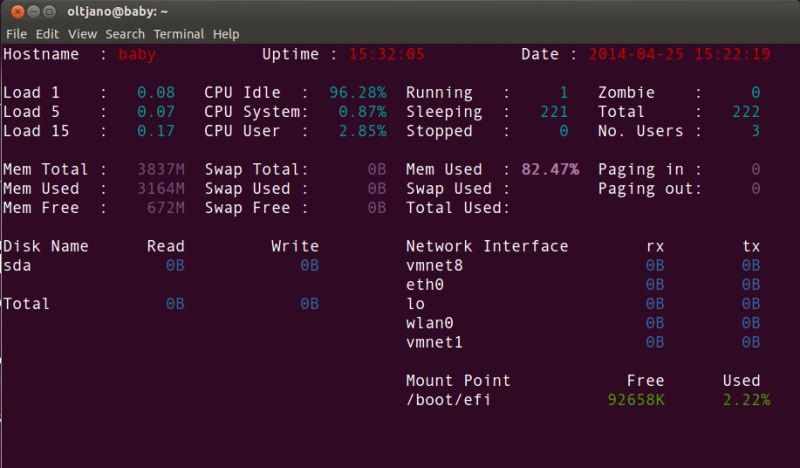 Saidar是一个简单且轻量的系统信息监控工具。虽然它无法提供大多性能报表,但是它能够通过一个简单明了的方式显示最有用的系统运行状况数据。你可以很容易地看到运行时间、平均负载、CPU、内存、进程、磁盘和网络接口统计信息。