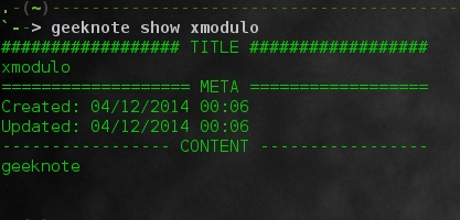 上面的命令中,只有‘title’是必须的,它会与一条新笔记的标题相关联。其他的标注可以为笔记添加额外的元数据:添加标签来与你的笔记关联、指定放在那个笔记本里。同样,如果你的标题或者内容中有空格,不要忘记将它们放在引号中。
