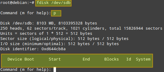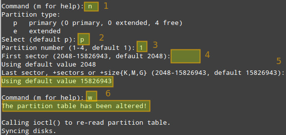 磁盘上没有分区,所以我们使用命令 [’n’] 创建一个主分区[‘p’], 分配分区号为[‘1’] 并且指定大小。你可以按回车使用默认值,或者输入一个你想设置的值。如下图: