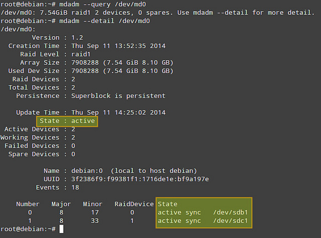 ‘mdadm -D’命令提供的信息中,最重要就是阵列状态类。激活状态说明阵列正在进行读写操作。其他几个状态分别为:完成(读写完成)、降级(有一块磁盘失效或丢失)或者恢复中(一张新盘已插入,系统正在写入数据)。这几个状态涵盖了大多数情况。