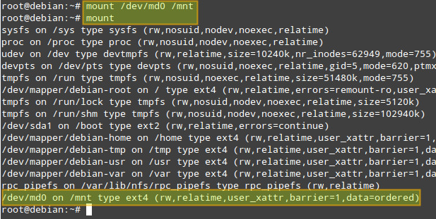 # echo "/dev/md0 /mnt ext4 defaults 0 2" << /etc/fstab