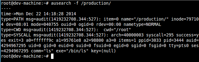 下一步,使用root账户的ls命令列出 /production/ 下的文件信息。再次使用ausearch后,将会显示一些信息。