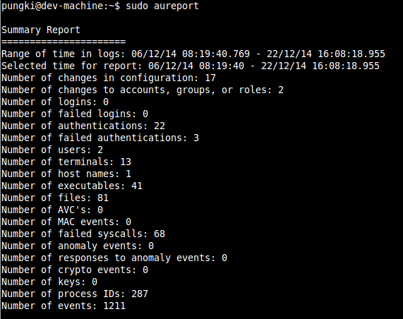 生成审计报告,我们可以使用aureport工具。不带参数运行的话,可以生成审计活动的概述。