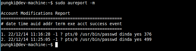 一旦定义审计规则后,它会自动运行。过一段时间后,我们可以看看auditd是如何帮我们跟踪审计的。