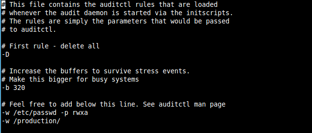 现在,如果确信这些规则可以正常工作,我们可以将其添加到**/etc/audit/audit.rules**中使得规则永久有效。以下介绍如何将他们添加到/etc/audit/audit.rules中去。