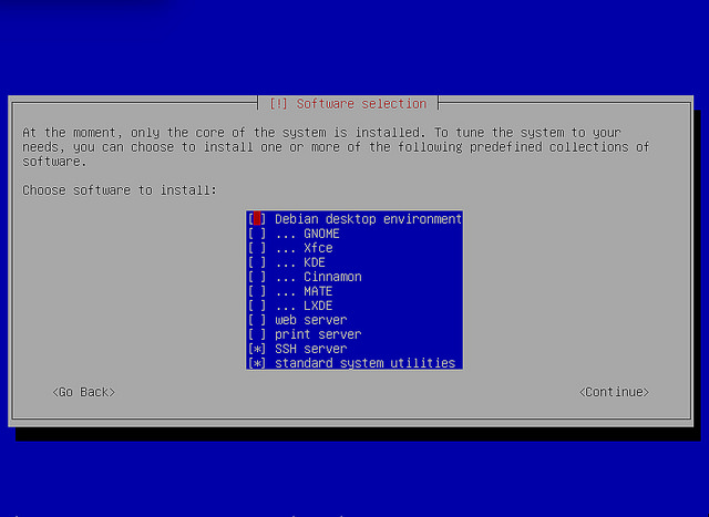安装一个图形桌面需要安装成百上千的包 —— 这些额外的工作可以稍后再进行。如果你遇到问题了,等待图形桌面的安装会浪费很多时间。同时,没有桌面组件,系统的启动可以更快一些 —— 只需要几十秒而不是几分钟。整个安装过程会需要重启几次,因此这样做可以节省不少时间。