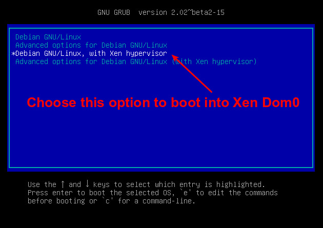 最后重启。几秒钟后,grub 启动菜单出现了。检查看第三个选项 “Debian GNU/Linux, with Xen hypervisor” 是否是自动选中的选项。