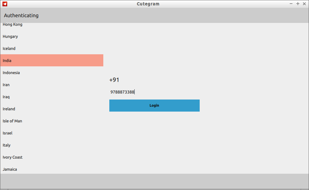 在菜单或者Unity dash中启动Cutegram。在登录界面,选择你的国家并输入电话号码,最好点击Login