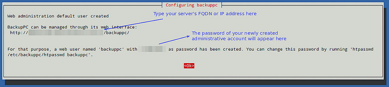 接着类似于下面的截屏将会呈现在你眼前,通知你创建了一个用来管理 BackupPC 的名为 ‘backuppc’的管理员用户以及相应的密码(如果你需要,这个密码以后可以更改)。这里需要注意的是:这里创建了同样名为 ‘backuppc’的 HTTP 账户和常规的 Linux 账户,它们使用相同的密码。需要前者的目的是来访问受保护的 BackupPC 的 Web 界面,而后者则是为了通过 SSH 来使用 rsync 来执行备份任务。