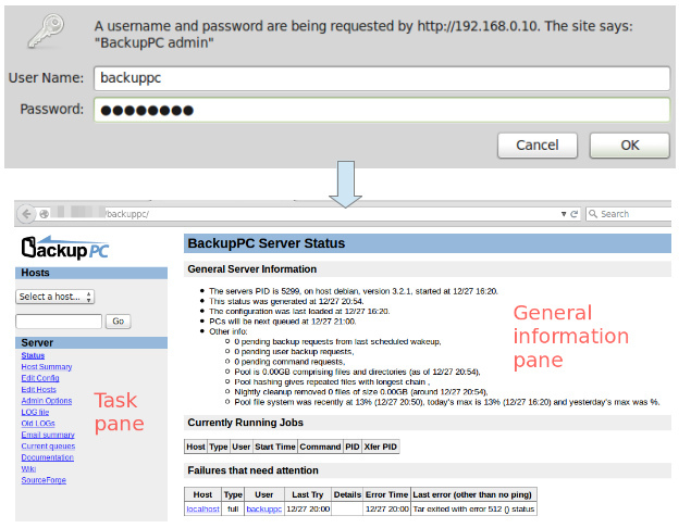 首先,打开一个浏览器窗口并指向 http://<服务器名称或 IP 地址>/backuppc/ 。当弹出提示框时,输入先前向你创建的默认 HTTP 用户凭据(注:即用户名 backuppc 和相应的默认密码)。假如认证成功,你就会被带入到 Web 界面的主页: