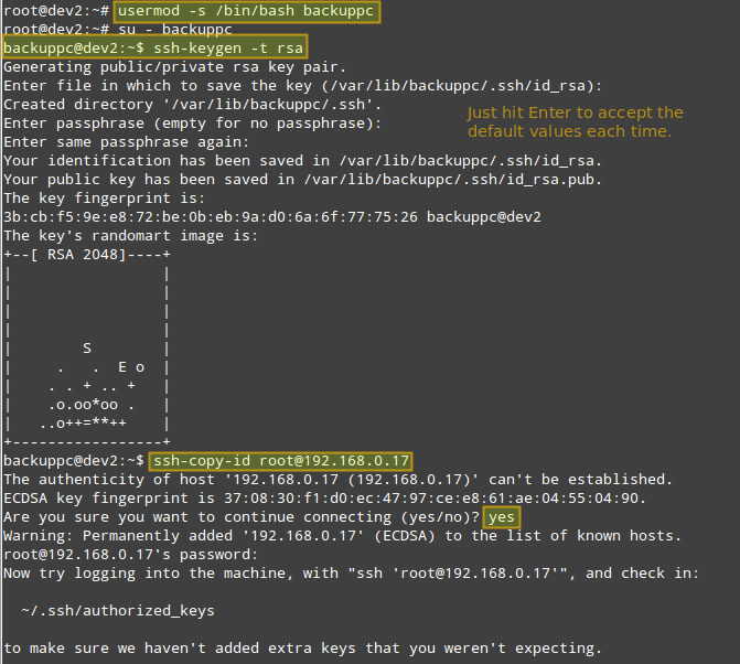 下面是关于如何为一个远程 CentOS 主机设置基于密钥认证的指导。我们创建 ‘backuppc’ 用户的 RSA 密钥对,并将其公钥传输给 CentOS 主机上的 root 账户。