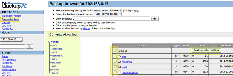 要浏览这些保存的文件,进入每个主机的主菜单下的 “浏览备份”选项,你可以一目了然地看到目录和文件,并选择那些你想恢复的文件。另外,你还可以通过点击文件来使用默认程序打开文件或右击文件并选择“另存为”来下载该文件到你当前的机器上: