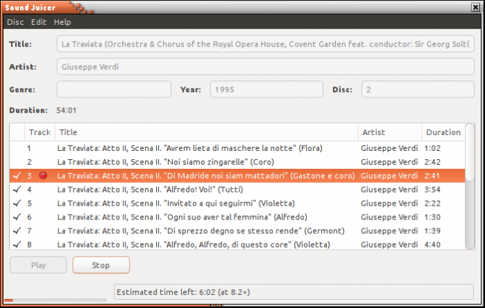 Sound Juicer是个使用GTK+和GStreamer开发的轻量级CD提取器。它从CD中提取音频并把它转换成音频文件。Sound Juicer还可以直接播放CD中的音轨,在提取前提供预览。