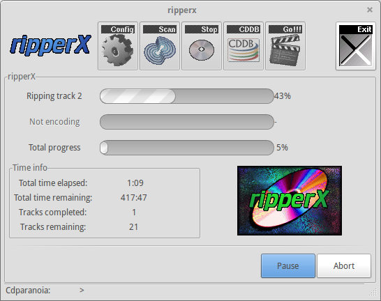 ripperX是个开源的图形界面的程序,用于提取CD音轨并把他们编码成Ogg、MP2、MP3或FLAC格式。它的目的是容易使用,只需要点几下鼠标就能转换整张专辑。它支持在CDDB寻找专辑和音轨信息。