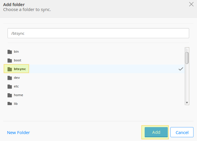 点击添加文件夹并在你的文件系统中选择一个你想要分享的目录,在我们的例子中,我们使用的是/btsync: