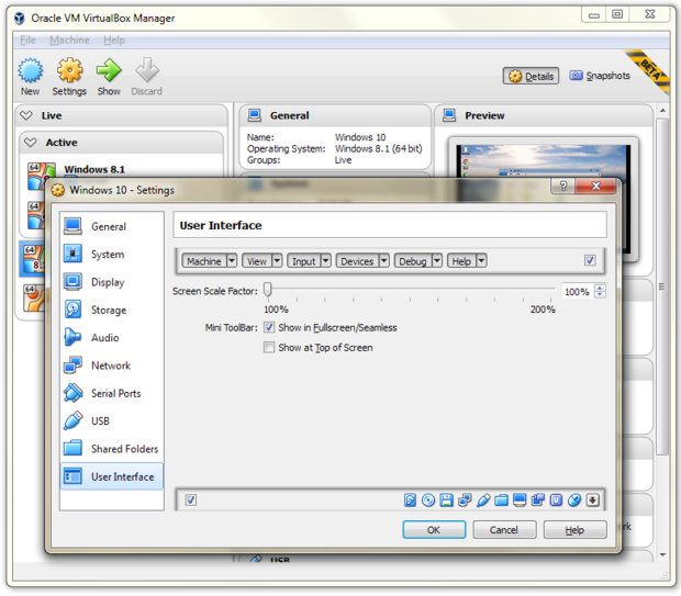 甲骨文公司提醒由于这是个测试版软件,需要谨慎对待。当然,主界面和客户机系统界面的某个角落打着红黑相间的测试警告标志。但之前VirtualBox发行版(4.3.26)上创建的Windows 10虚拟机启动和运行都没问题,5.0版本中添加的VirtualBox客户机功能–更好的视频支持,双向复制和粘贴,以及其它功能–在安装的时候也没有问题。(从4.3.18版本就改进了对 Windows 10的支持)。