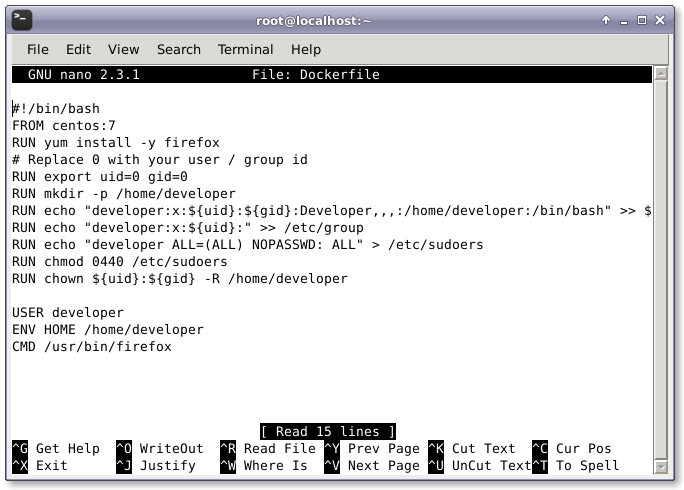 现在,Docker守护进程已经在运行中了,我们现在准备创建自己的Firefox Docker容器。我们要创建一个Dockerfile,在其中我们要输入需要的配置来创建一个可以工作的Firefox容器。为了运行 Docker 镜像我们需要使用最新版本的CentOS。要创建 Docker 镜像,我们需要用文本编辑器创建一个名为Dockerfile的文件。