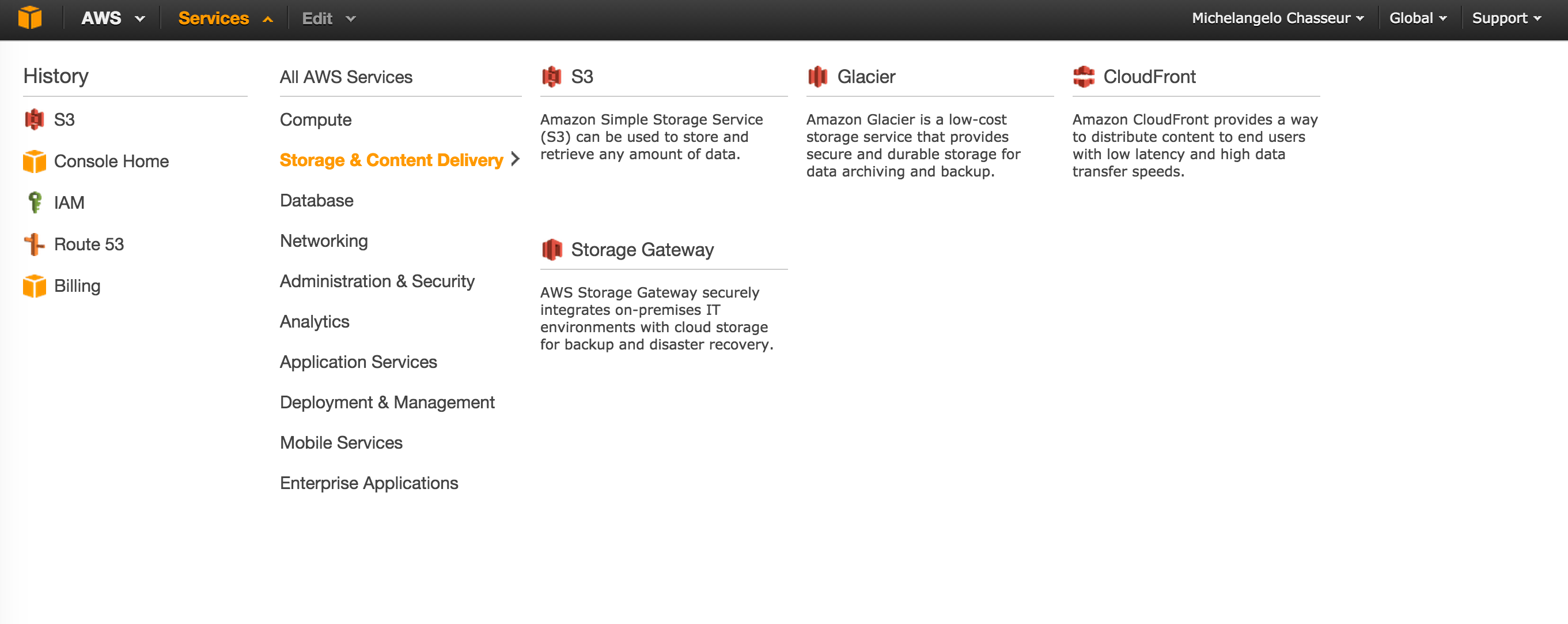 登录到我们的AWS账号(如果没有,就申请一个http://aws.amazon.com/),在控制台选择S3(Simpole Storage Service)。