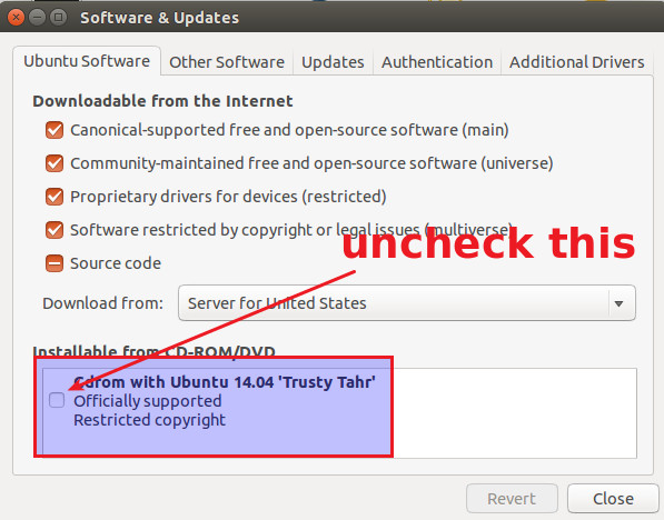 在Ubuntu Software的第一个标签中,找到cdrom,如果它是勾选的,那么取消勾选。