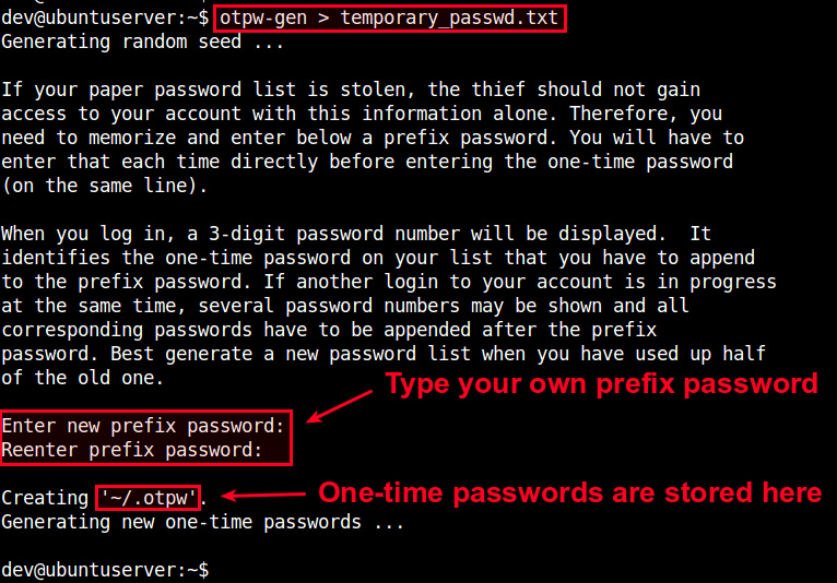 设置好密码前缀后,这个命令会产生 280 个一次性密码(LCTT 译注:保存到 ~/.otpw 下),并将它们导出到一个文本文件中(如 temporary_password.txt)。每个密码(默认是 8 个字符)由一个 3 位十进制数索引。你需要将这个密码表打印出来,并随身携带。