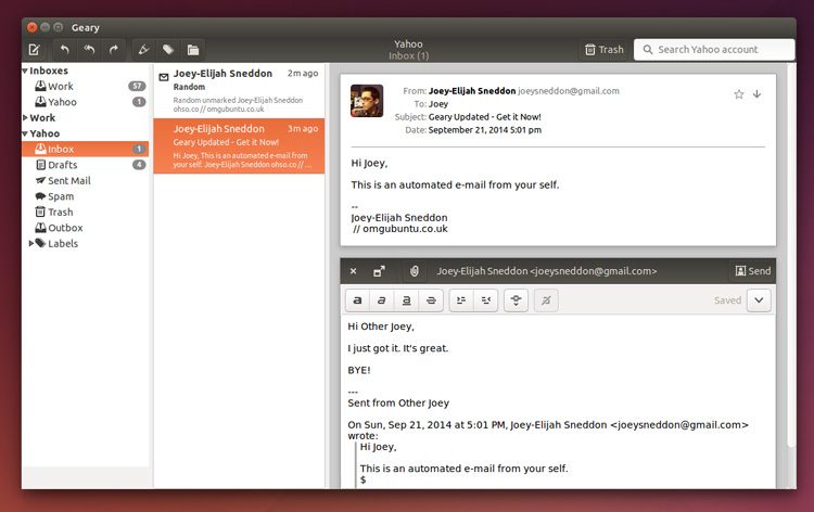 如果你在Geary中设置Gmail账户来收取你的Yahoo,Outlook和KittyMail信件,你可以看到现在它们都整齐地放在一起,当你写信时在’From’栏你可以选择指定账户作为发送人。这并不是最重要,但是却是最经常被人要求的的功能。