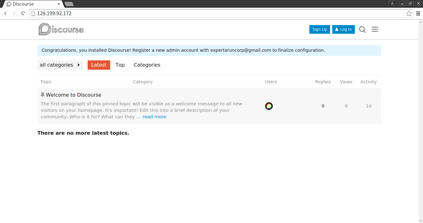 如果一切都正常,我们就能使用惯用的浏览器来访问我们新鲜出炉的 Discourse 的 Web 界面了: http://ip-address/ 或 http://discourse.linoxide.com/ 。然后,我们就可以创建一个新账号并成为管理员。