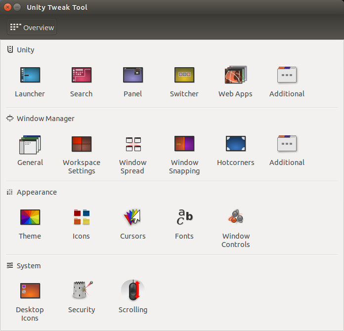 Unity Tweak Tool 是个流行的 Unity 桌面自定制工具。顾名思义,该工具只适用于 Ubuntu 的默认桌面环境(例如,基于 Unity 的 GNOME 桌面)。这个多功能的工具允许你通过非常直观和简单易用的图形用户界面自定义多种 Unity 桌面特性。它的菜单看起来类似于 Ubuntu 的官方系统设置,但它的桌面自定制能力远远超过默认的系统设置。通过使用 Unity Tweak Tool,你可以自定制外观、行为以及很多桌面组件的配置,例如工作区、窗口、图标、主题、光标、字体、滑动、热键等等。如果你是 Unity 桌面用户,Unity Tweak Tool 一定是个必不可少的应用程序。