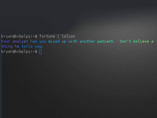 厌倦了老旧的文本?想向世界展示出自己的个性?使用lolcat。安装它,然后在任何地方使用。它可以接收任何文本,然后将其转换成美轮美奂的彩虹效果。可以使用fortune | lolcat体验。