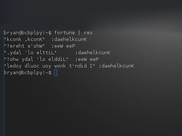 将任何文本使用管道输送给rev命令,它就会将文本内容逆序输出。fortune | rev会给你好运。当然,这不意味着rev会将幸运(fortune)转换成不幸。