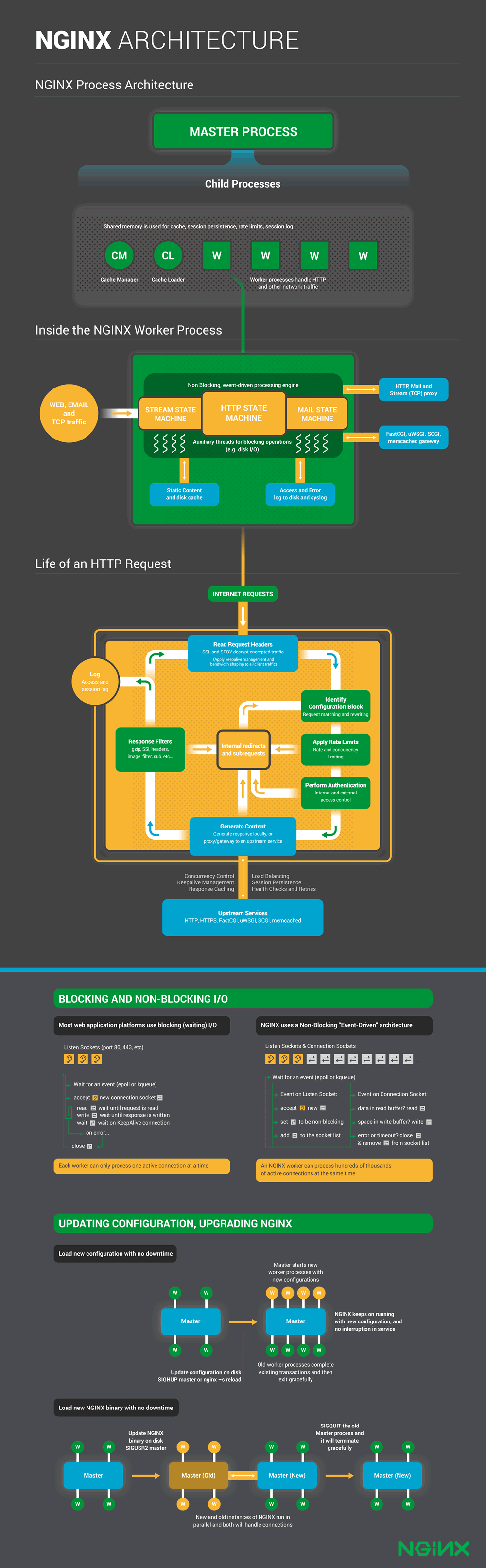 下面这张深入 NGINX 的信息图从高层次的进程架构上深度挖掘说明了 NGINX 如何在单一进程里保持多个连接。这篇博客进一步详细地解释了这一切是如何工作的。