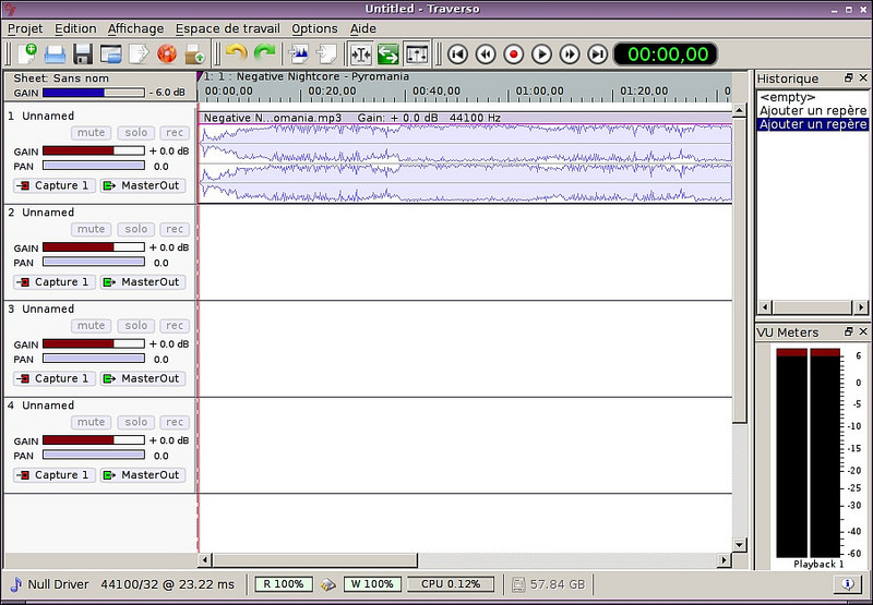 最后站在我面前的是Traverso,它支持无限制的音轨计数,并直接整合了CD烧录的功能。另外,它对我来说是介于简单的软件和专业的软件之间的程序。它的界面是KDE样式的,其键盘配置很简单。更有趣的是,Traverso会监视您的系统资源以确定不会超过您的CPU或者硬件的能力。