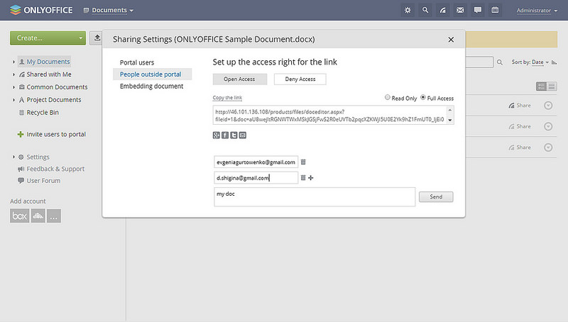 在打开的 Sharing Settings 窗口,点击左边的 People outside portal 链接,打开到文档的访问,并通过启用 Full Access 单选按钮给予完全访问权限。