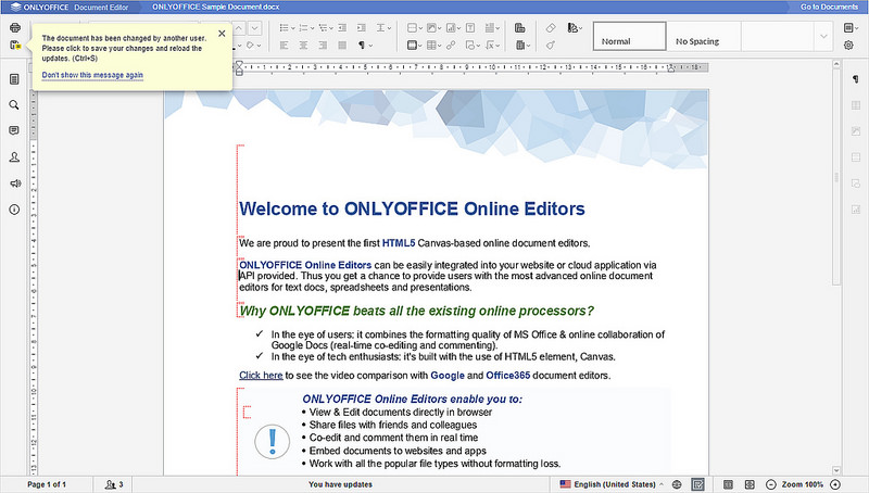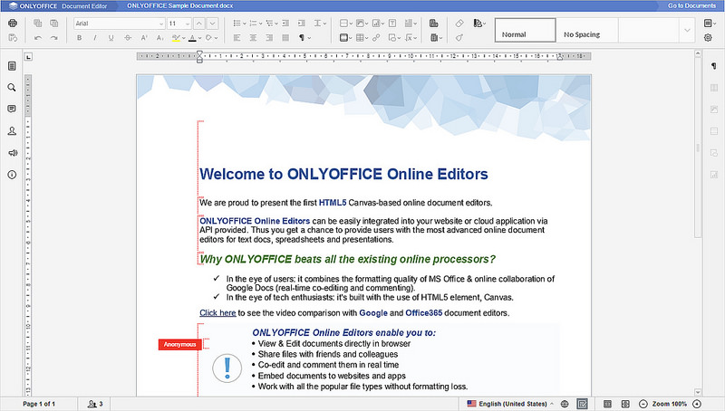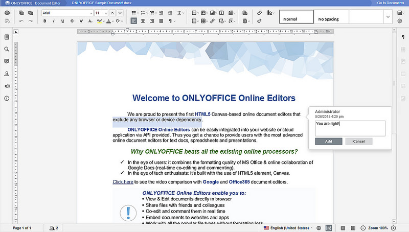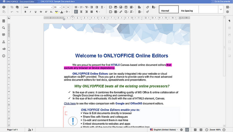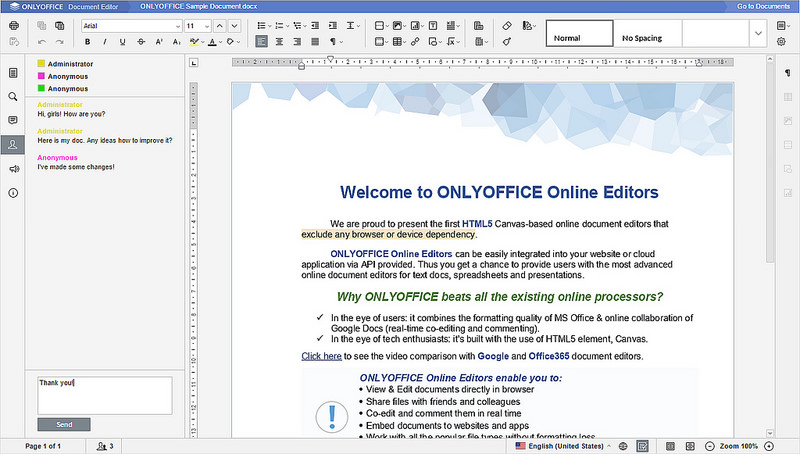 使用 ONLYOFFICE 办公套件,一组人可以同时编辑文本、电子表格或者在浏览器上进行展示。可以直接在他们的文档上留下评论并用其中集成的聊天工具和其他人沟通。最后,可以保存文档为 PDF 文件并打印。作为额外的增强功能,它还能浏览文档历史并在如果需要时恢复到之前的修订/版本。