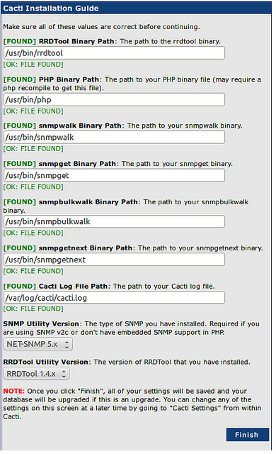 安装过程中Cacti的路径一般都是正确的,但是如有必要,请再次检查以下。