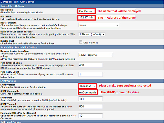Cacti将根据先前配置的SNMP字符串注册设备。在本教程中,我们将只添加启用了SNMP的本地服务器。
