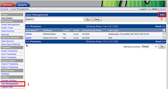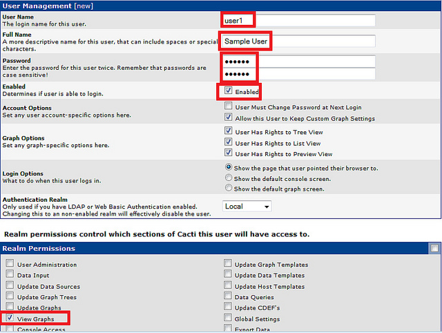 最后,我们创建一个只具有查看我们刚创建的图表权限的用户。Cacti内建了用户管理系统,而且是高度可定制的。