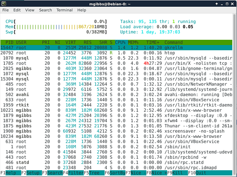 相比top,它的替代品Htop则更为精致。维基百科是这样描述的:“用户经常会部署htop以免Unix top不能提供关于系统进程的足够信息,比如说当你在尝试发现应用程序里的一个小的内存泄露问题,Htop一般也能作为一个系统监听器来使用。相比top,它提供了一个更方便的光标控制界面来向进程发送信号。” (想了解更多细节猛戳这里)