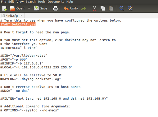 为了正确运行这个程序,我们需要执行一些基本的配置。运行下面的命令用gedit编辑器打开/etc/darkstat/init.cfg文件。