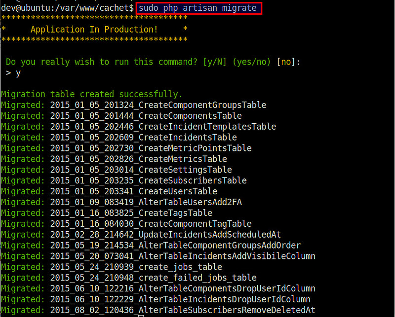 假设在 /var/www/cachet/.env 的数据库配置无误,数据库迁移应该像下面显示一样成功完成。