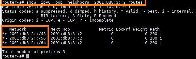 router-a# show bgp ipv6 neighbors <neighbor-IPv6-address> routes