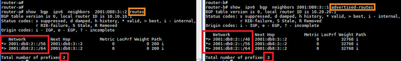 正如我们在上面看到的输出信息那样,路由间通告了他们完整的/48 IPv6前缀。出于演示的目的,我们会考虑以下要求。