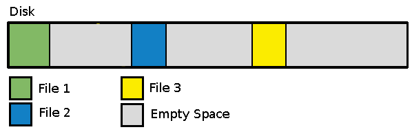 在像 FAT 和 FAT32 这类文件系统中,文件紧挨着写入到磁盘中。文件之间没有空间来用于增长或者更新: