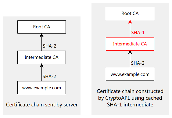 第一种方式是错误的。虽然 CA 可以用已有的中间证书使用 SHA-2 重新签名,但是浏览器也许会缓存着带有旧的 SHA-1 签名的中间证书。如上面解释的,浏览器可以忽略由服务器提供的链证书,即便服务器发送了带有新的 SHA-2 签名的中间证书,客户端依然会使用其所缓存的 SHA-1 中间证书来构建证书链。CryptoAPI 就是这样的。