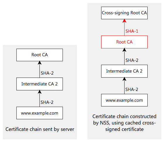 有时候根证书自身也由其它的根证书签名,通常这称之为 交叉签名 ( cross-signing ) 。这提供了一个抵达可信根证书的另外一条路径,交叉签名可以让一个不在你的浏览器的可信证书库中的新根证书也可以工作。当浏览器开始信任一个根证书时,交叉签名的证书就不再需要了。然而,和中间证书一样,交叉签名的证书也是可以缓存的,而在 NSS 中一个 bug 会导致 Linux 上的 Chrome 使用缓存的交叉签名的根证书,即使有更短和更新的证书链存在。如果这个缓存的交叉签名证书正好使用 SHA-1,Chrome 就会使用这个有问题的证书链并显示一个红叉,而不管你的服务器是否发送了全都使用 SHA-2 的证书链。