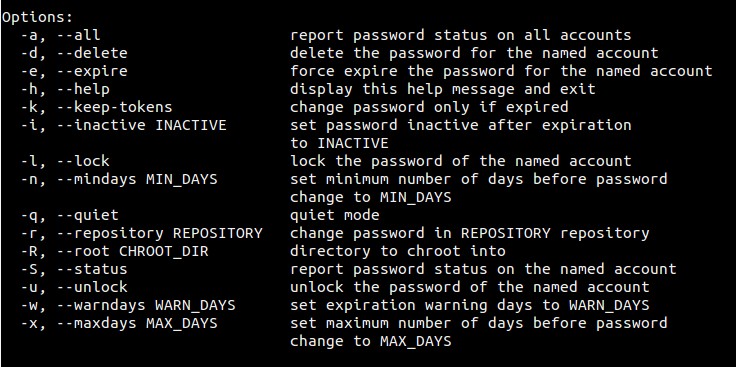 可以在 passwd 命令使用不同的选项,列表如下: