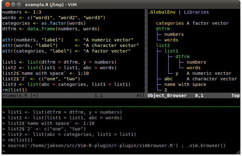 在谈论完 Emacs 后,因为我不想去讨论 Emacs 和 Vim 的优劣,所以我尽力给予 Vim 同样的待遇,下面介绍 Vim R 插件。使用名为 tmux 的终端工具,这个工具使得在开启一个 R 控制台的同时,又书写 R 代码成为可能。但最为重要的是,它还为 Vim 带来了 R 语言的语法高亮和自动补全。你还可以轻易地获取 R 帮助文档和浏览数据对象。但再次强调,这些强大的功能来源于它大量的自定义选项和 Vim 的速度。假如你被这些功能所诱惑,我希望你能够通读有关介绍如何安装这个插件并设置相关环境的文档。