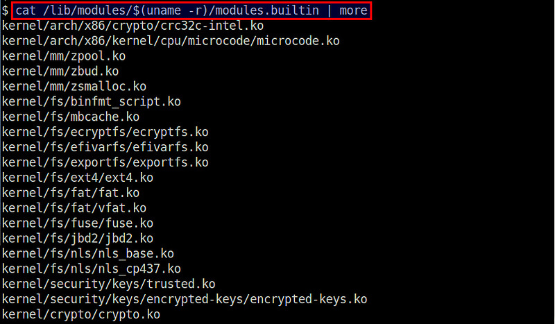 $ cat /lib/modules/$(uname -r)/modules.builtin